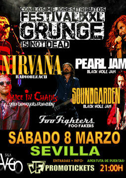 ¡No te pierdas el increíble homenaje a Nirvana, Pearl Jam, Foo Fighters, Soundgarden y Alice In Chains en el gran evento que se llevará a cabo el 8 DE MARZO en LA SALA EVEN DE SEVILLA! Disfrutarás de los mejores tributos a estas icónicas bandas del grunge.