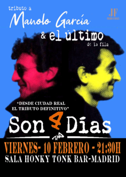 El Último de la Fila fue un grupo musical de rock español con influencias de la rumba catalana, formado por Manolo García (vocalista) y Quimi Portet (guitarrista), y surgido en la ciudad de Barcelona. Ha sido uno de los grupos musicales de más éxito en España durante las décadas de 1980 y de 1990, años en los que desarrollaron siete álbumes musicales y numerosas giras, generalmente en España, aunque también en diversos países de Hispanoamérica. SON 4 DIAS TAMBIEN TRIBUTAN AL CANTAUTOR EN SUS GRANDES EXITOS COMO MANOLO GARCIA.