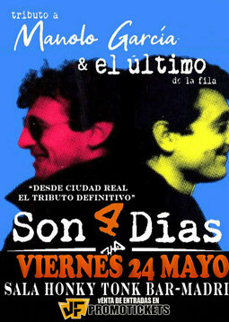 El Último de la Fila fue un grupo musical de rock español con influencias de la rumba catalana, formado por Manolo García (vocalista) y Quimi Portet (guitarrista), y surgido en la ciudad de Barcelona. Ha sido uno de los grupos musicales de más éxito en España durante las décadas de 1980 y de 1990, años en los que desarrollaron siete álbumes musicales y numerosas giras, generalmente en España, aunque también en diversos países de Hispanoamérica. SON 4 DIAS TAMBIEN TRIBUTAN AL CANTAUTOR EN SUS GRANDES EXITOS COMO MANOLO GARCIA.