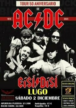 Con motivo de la celebración del 50 ANIVERSARIO de la banda australiana, EISI DISI hará un exhaustivo repaso por todos los hits y caras B desde sus inicios con Bon Scott hasta la etapa actual con Brian Johnson. Será un intenso concierto en el que la DIVERSIÓN, la ENERGÍA y el ROCK’N’ROLL estarán garantizados. Disfruta con EISI/DISI de una noche de Rock inolvidable y ELECTRIZANTE.